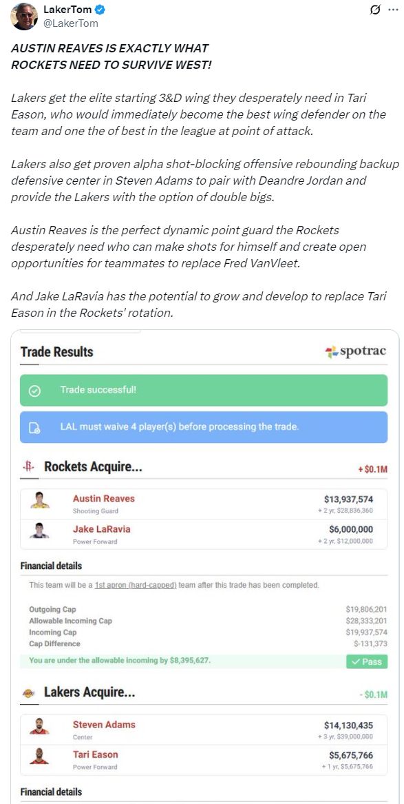 湖媒Laker Tom此前还建议火箭与湖人交易,火箭的先发控卫范弗利特赛季报销,他们会很需要奥斯汀-里夫斯这样的持球大核+组织核心,而湖人恰巧需要的是尺寸与侧翼防守,那么就是一拍即合,湖人送出里夫斯、拉拉维亚得到亚当斯、伊森,他认为这笔交易是双赢。